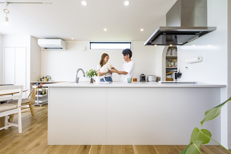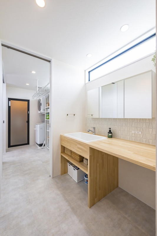 2025.11.21 【S様邸】回遊動線は家事ラクの極み!今も未来もステキに暮らせる家 シンプルさが際立つガルバリウムの外観。ハイサッシと大きな四角いフィックス窓から陽光があふれるLDKは、家族を近くに感じる一体感が嬉しい。床は色味にこだわった突き板フローリング。子供達の思春期も考慮して洗面と脱衣を分割。造作洗面台は複数人で並んでも余裕のサイズ。広い土間のおかげで一度に大勢帰宅しても渋滞知らず。ハイドアと勾配天井が開放感を高めている。